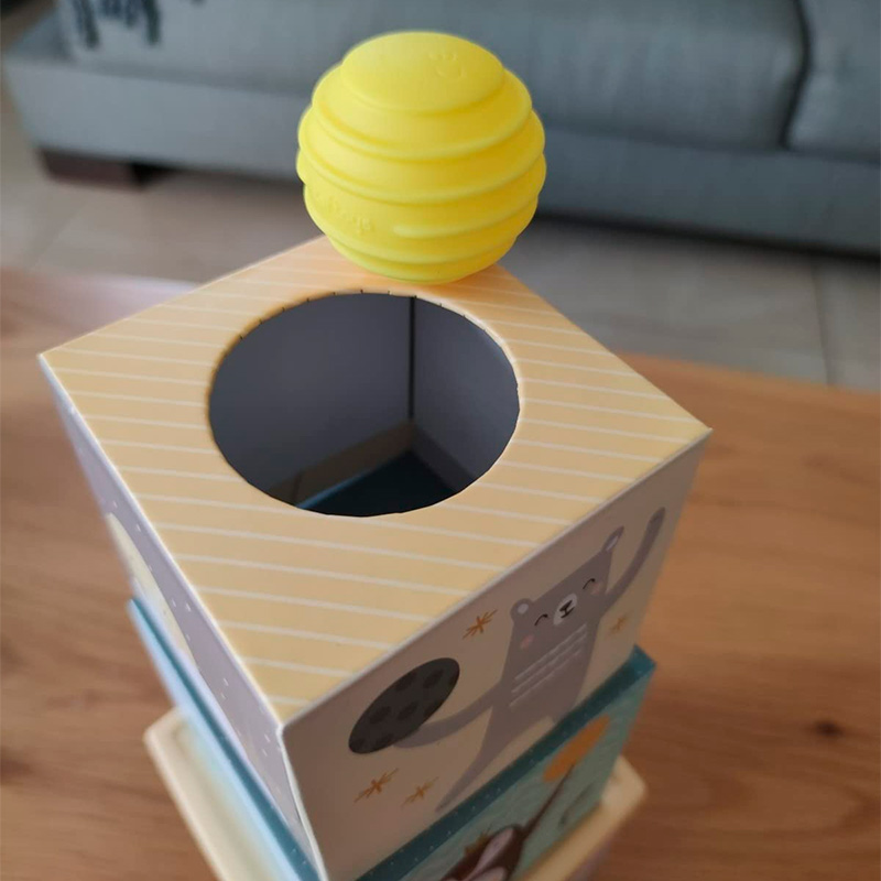“Las cajas son sólidas y fáciles de apilar. Las pelotas vienen en diferentes texturas y tamaños, perfectas para estimular a mi bebé. ¡Super recomendable!”