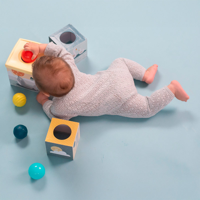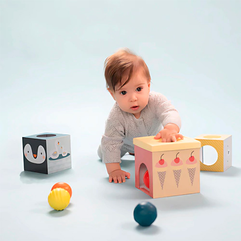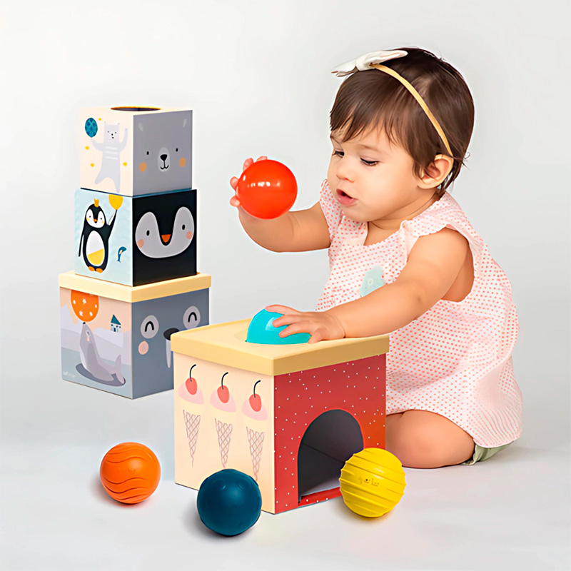 ‣ Incluye: 3 cajas apilables ilustradas, 1 tapa insertable para la caja base, 5 pelotas sensoriales.