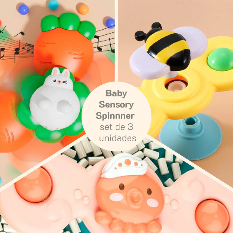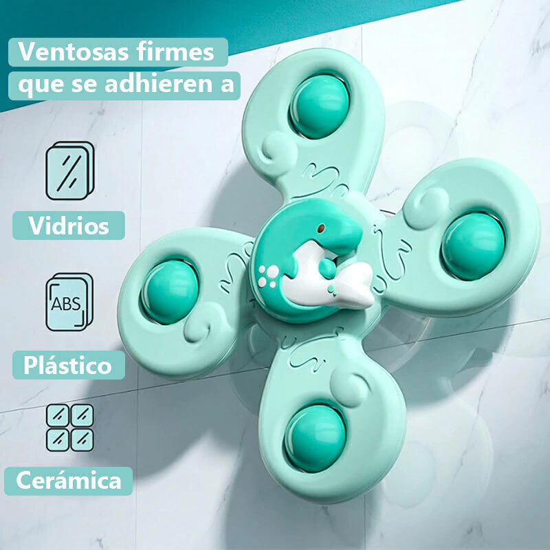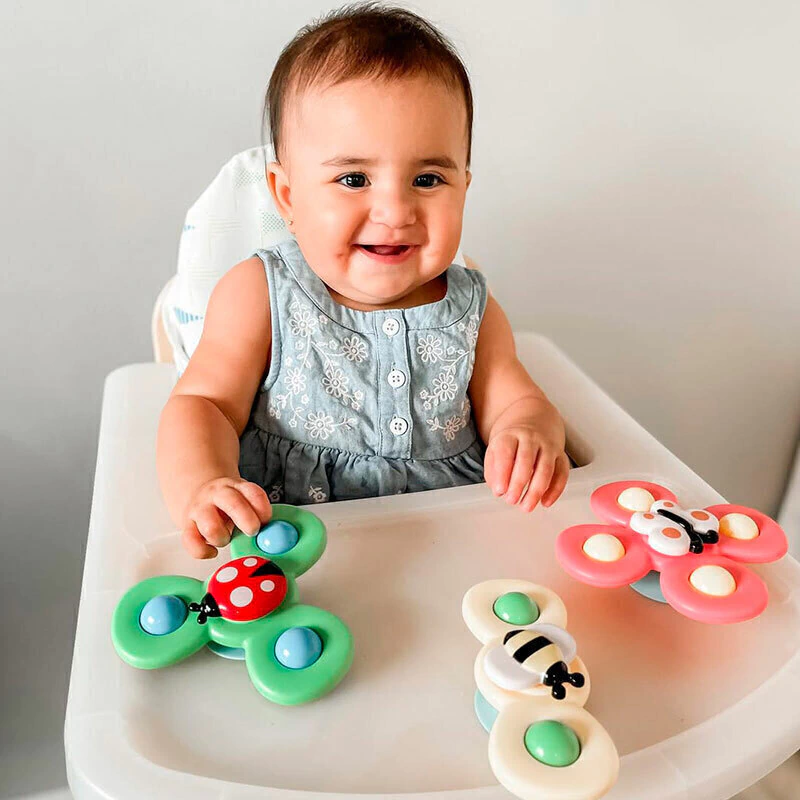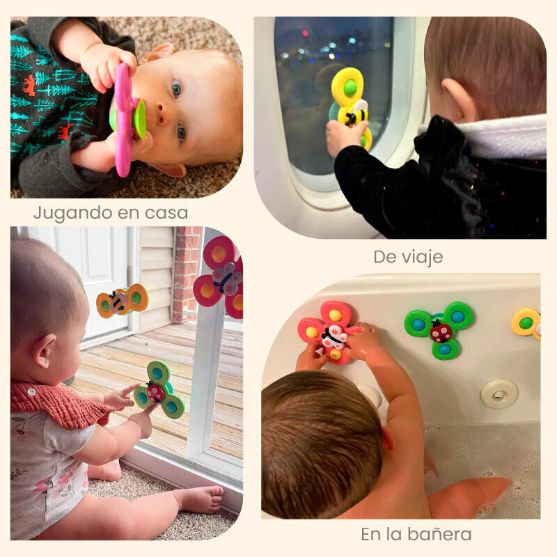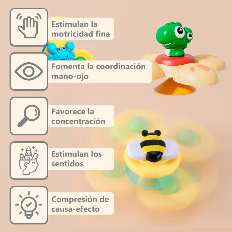 Set de 3 juguetes giratorios con ventosa que estimula los sentidos del tacto, visual y auditivo del peque.