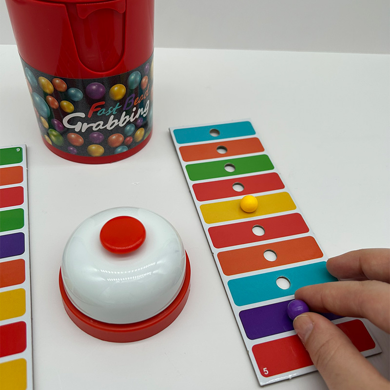 Mejora la coordinación mano–ojo al tomar la pelotita correcta.