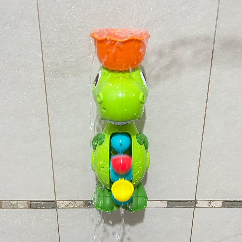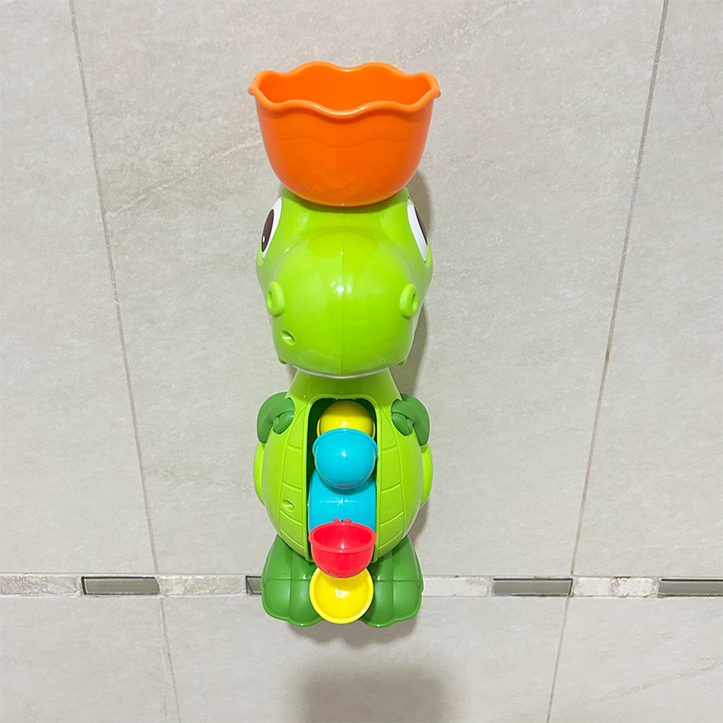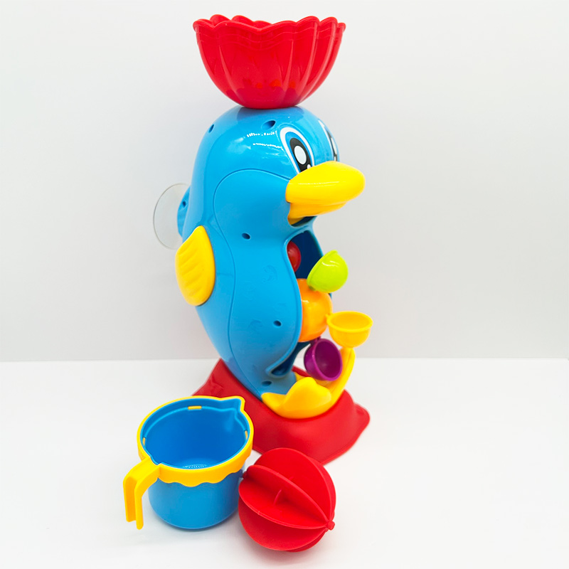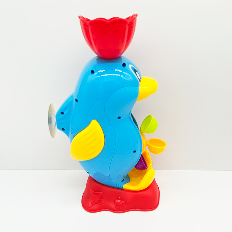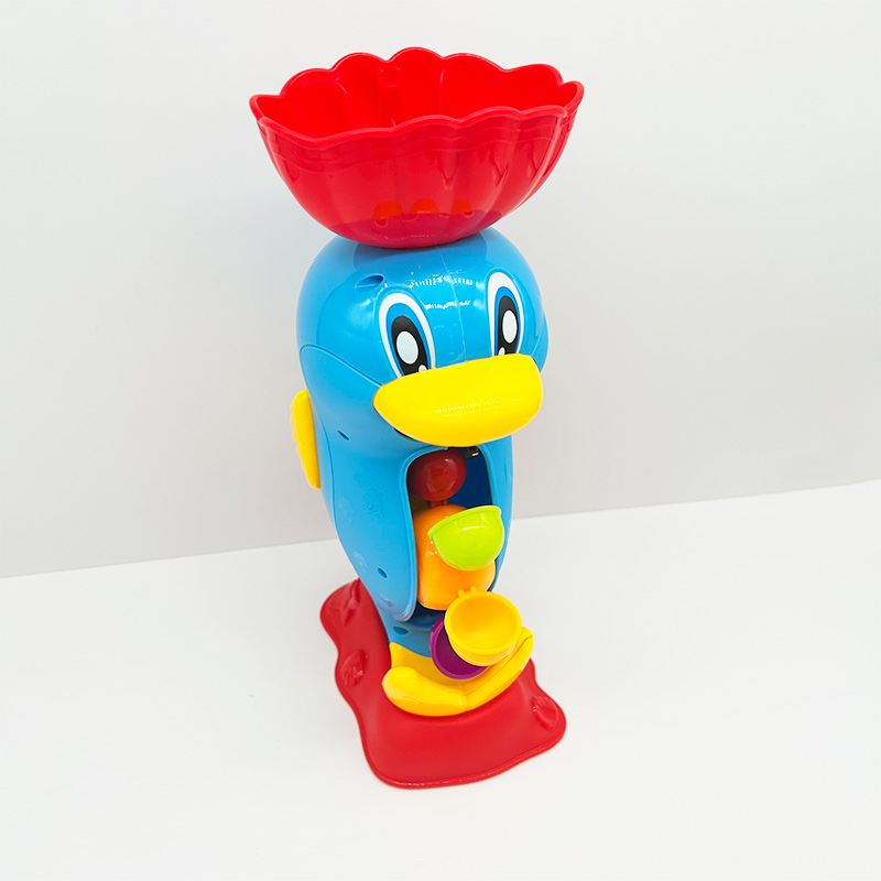 Hermoso juguete giratorio de baño que activa piezas móviles al verter agua.