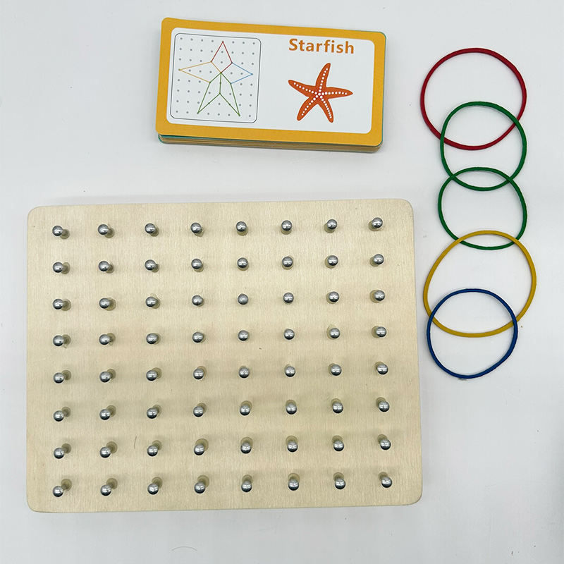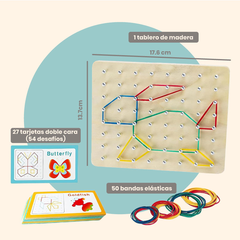 Tablero para crear figuras con elásticas que permite el desarrollo de habilidades mientras el peque se divierte.