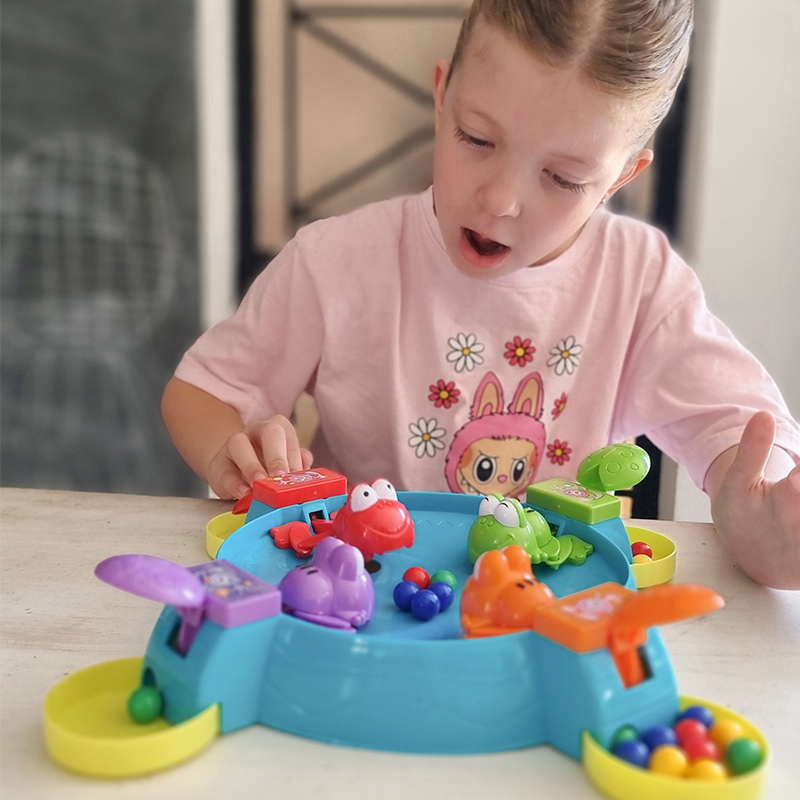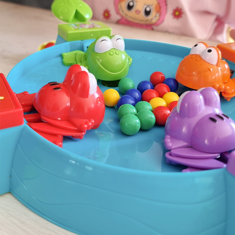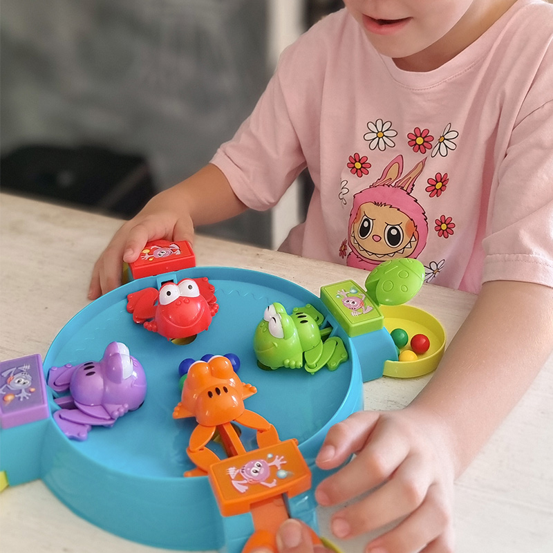 Al grito de “¡Ya!”, cada jugador presiona rápidamente la palanca de su rana para atrapar la mayor cantidad de bolitas.