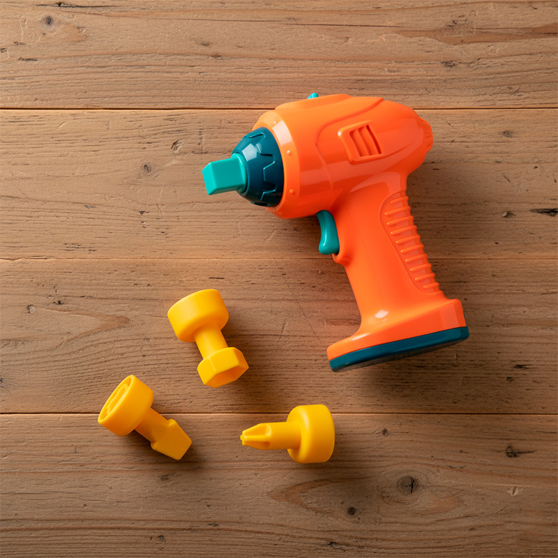 ‣ Taladro eléctrico de juguete con giro en ambas direcciones y 3 puntas intercambiables.