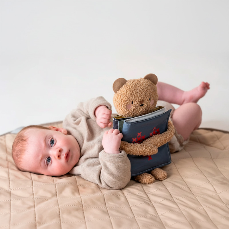 El osito ofrece contención emocional y acompaña al bebé en momentos de calma, siestas y rutinas afectivas.