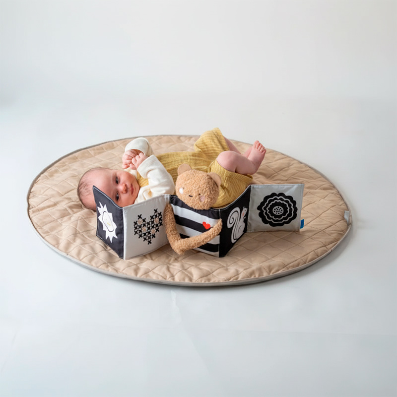 Libro-Osito sensorial doble cara que estimula la vista desde el nacimiento con patrones de alto contraste y colores suaves.