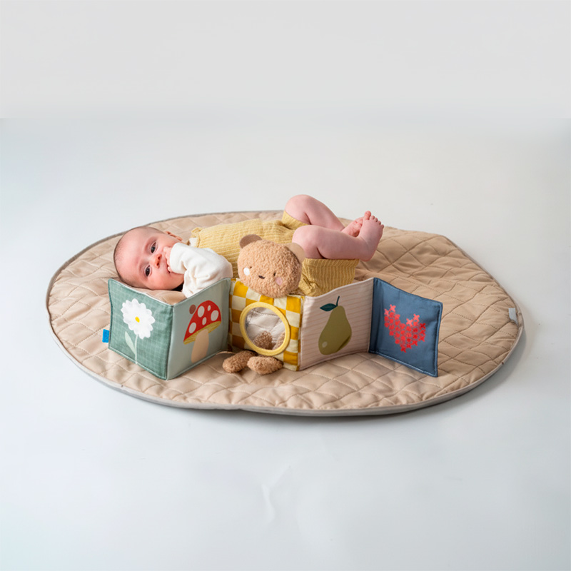 ‣ Actividades que incentivan la curiosidad: espejo, texturas, sonido crinkle y solapa peek-a-boo.