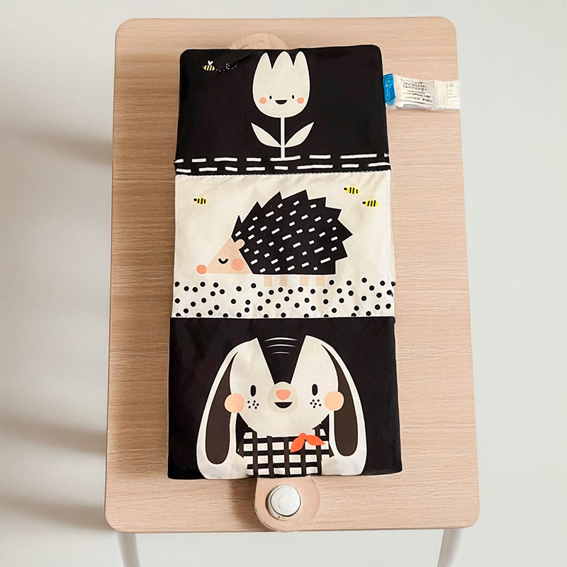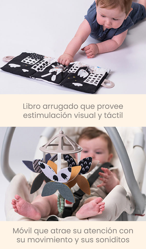 ‣ Incluye: 1 libro arrugado blanco y negro, 1 sonajero con mordedores, 1 conejito chirriador, 1 móvil con campanilla, 6 tarjetas de hitos (doble cara).