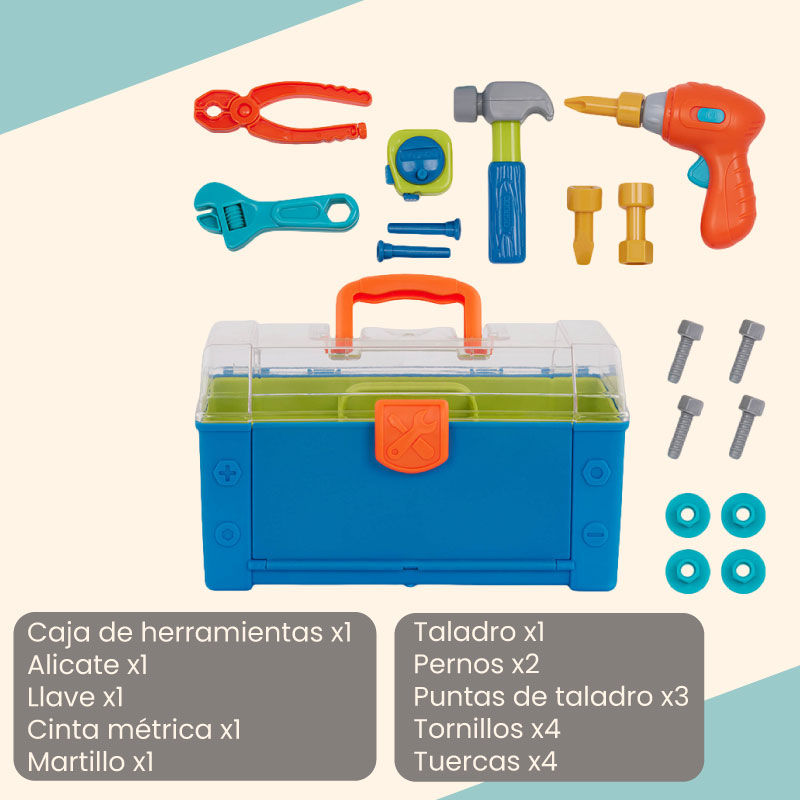 ‣ Incluye: taladro a cuerda, martillo, llave, alicates, cinta métrica funcional, tuercas, pernos, clavos, caja de herramientas.