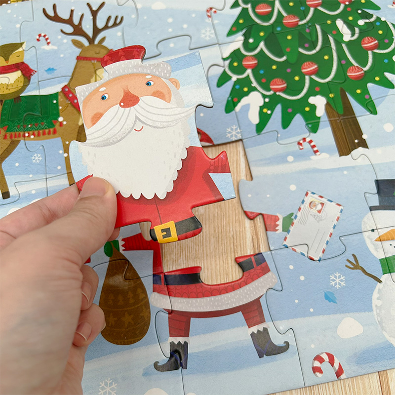 Un hermoso rompecabezas navideño con Santa, el reno, el árbol, los elfos y más.