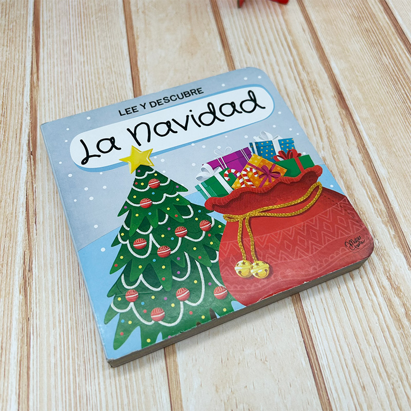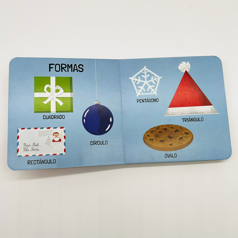 El libro introduce colores, formas, números y palabras navideñas, reforzando la comprensión verbal y el aprendizaje temprano.