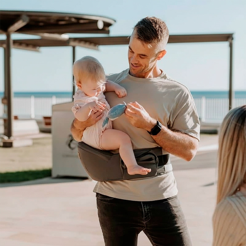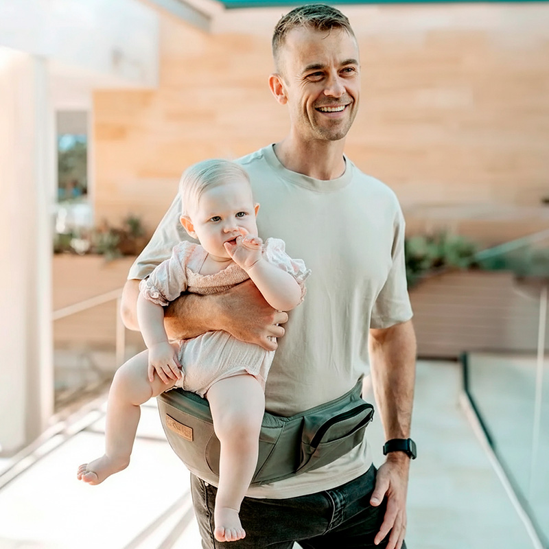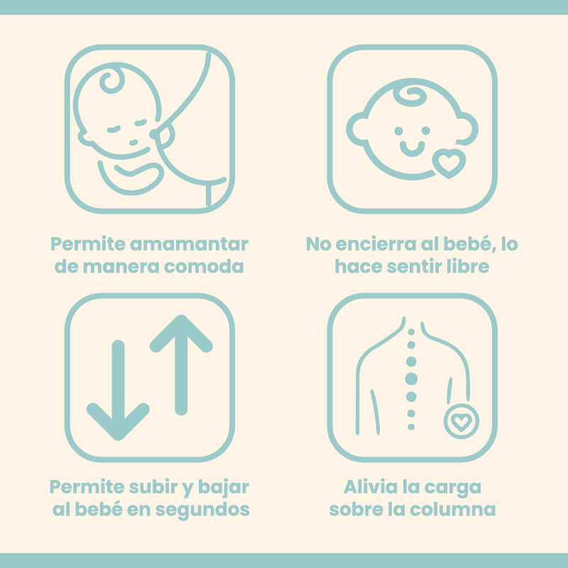 Es un cinturón/soporte ergonómico portabebés tipo asiento, fácil de colocar y le brinda al bebé mayor libertad.
